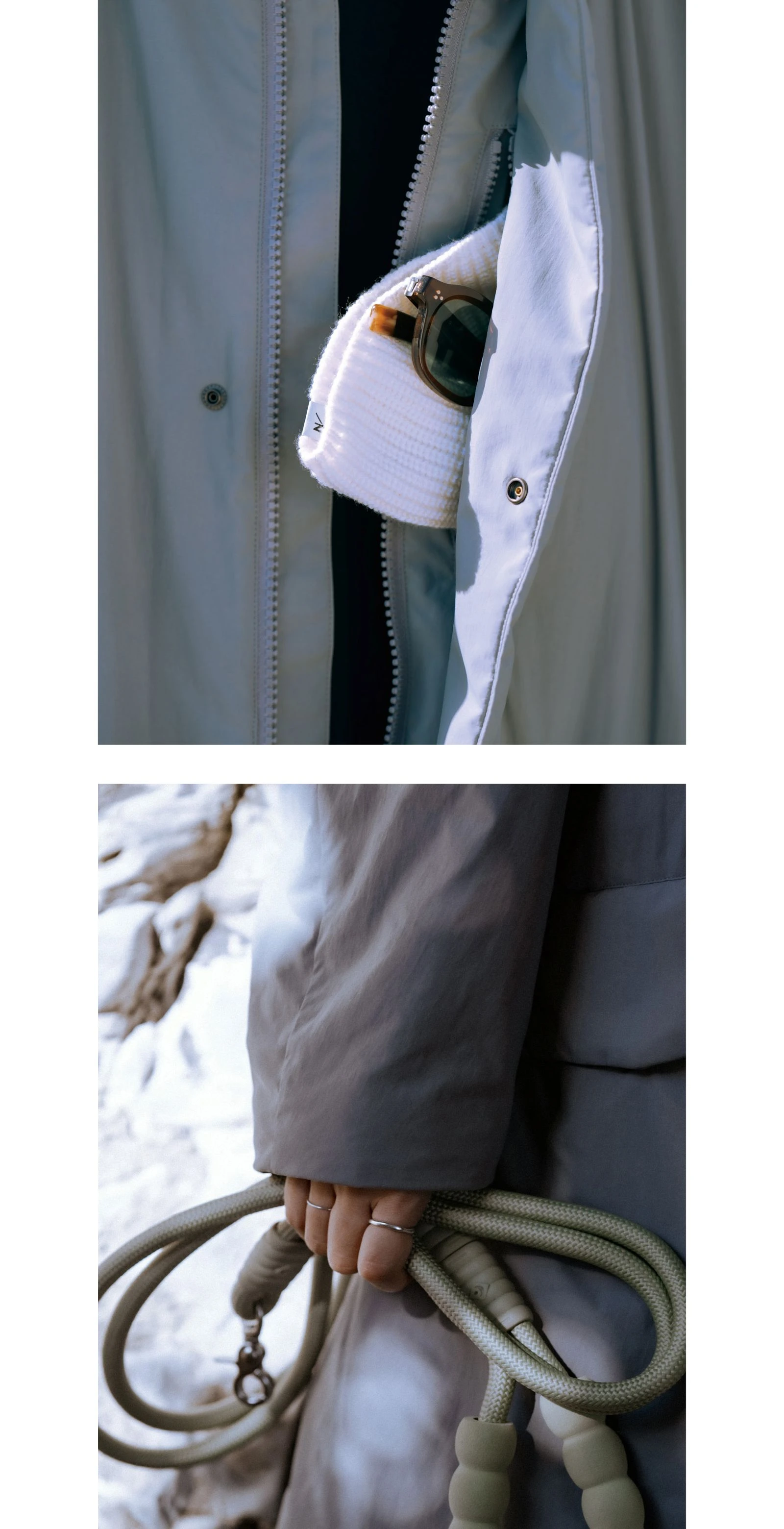 海辺で暮らし、愛犬とともに日々を過ごすあなたにとって、海沿いの散歩は欠かせない日課だ。しかし海の天気は気まぐれで、やわらかく見える潮風は思いがけず体温を奪いもする。ICEVILLAGEは、そんな海辺の揺らぎに寄り添う。極寒地向けのモンスターパーカをベースに無骨さをそぎ落としてミニマルに再解釈し、胸ポケットには鍵やスマホなどをすぐにしまえる。光電子®中わたが衣服内を快適な温度に保ち、リサイクルナイロンの表地は冷たい潮風吹く散歩道でも安心感を与えてくれる。犬の歩幅に合わせて進む大切な時間を守る、そんなタフで軽やかなコート。