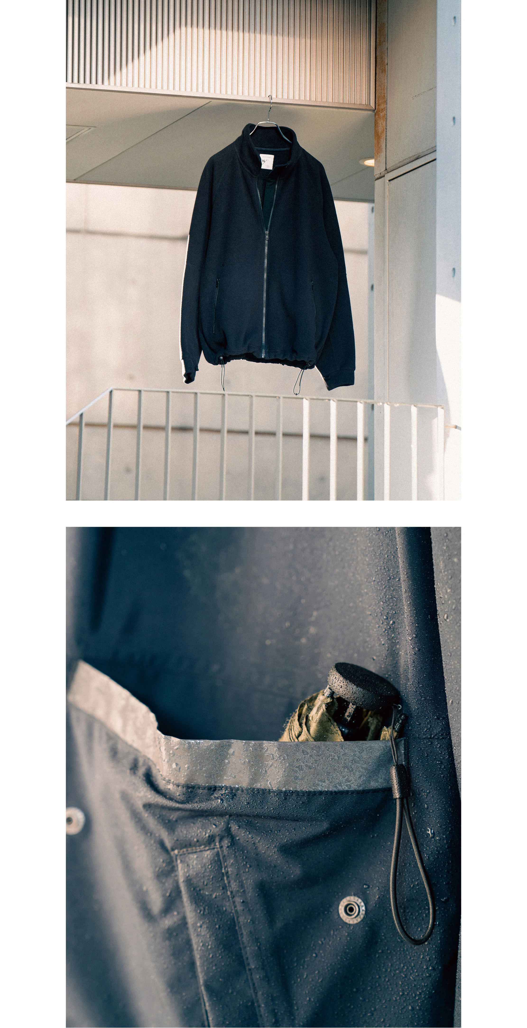 都市の朝に漂う、独特の冷たい空気を受け止める3WAY JACKET。着脱可能で単体でも羽織れるPOLARTEC のインナーフリースは、オフィスと屋外を往復する1日の寒暖差に柔軟にフィットする。ヨーロッパのユニフォーム古着と現代的なデザインが合わさったシルエットで都市の風景に自然と馴染み、撥水加工を施した表地のナイロンは予期せぬ小雨を軽やかに受け流してもくれる。夜遅くなった帰路には、フラップをしまった袖ポケットのリフレクが都市の光を拾う。大きく、多彩なポケットにアイデアを詰め込んで、創造的で軽快な日常へ。