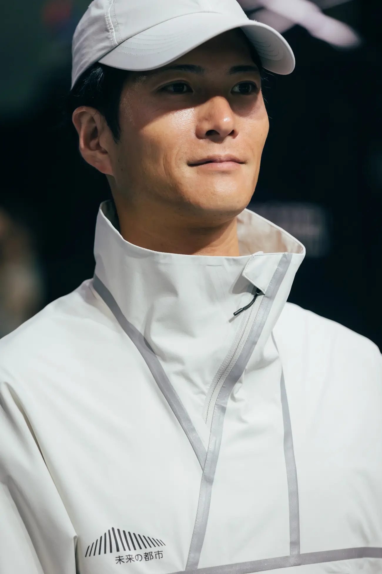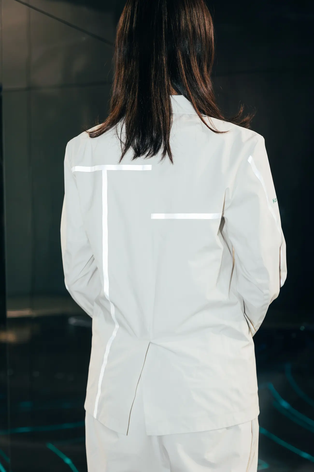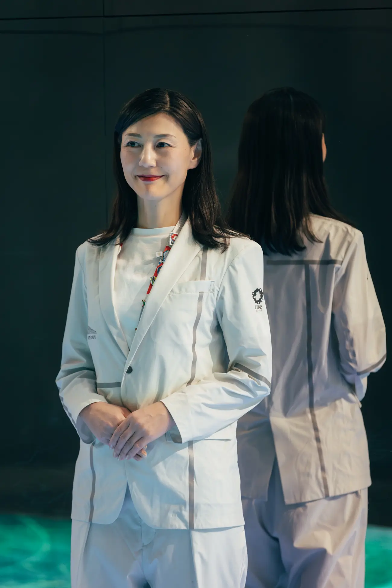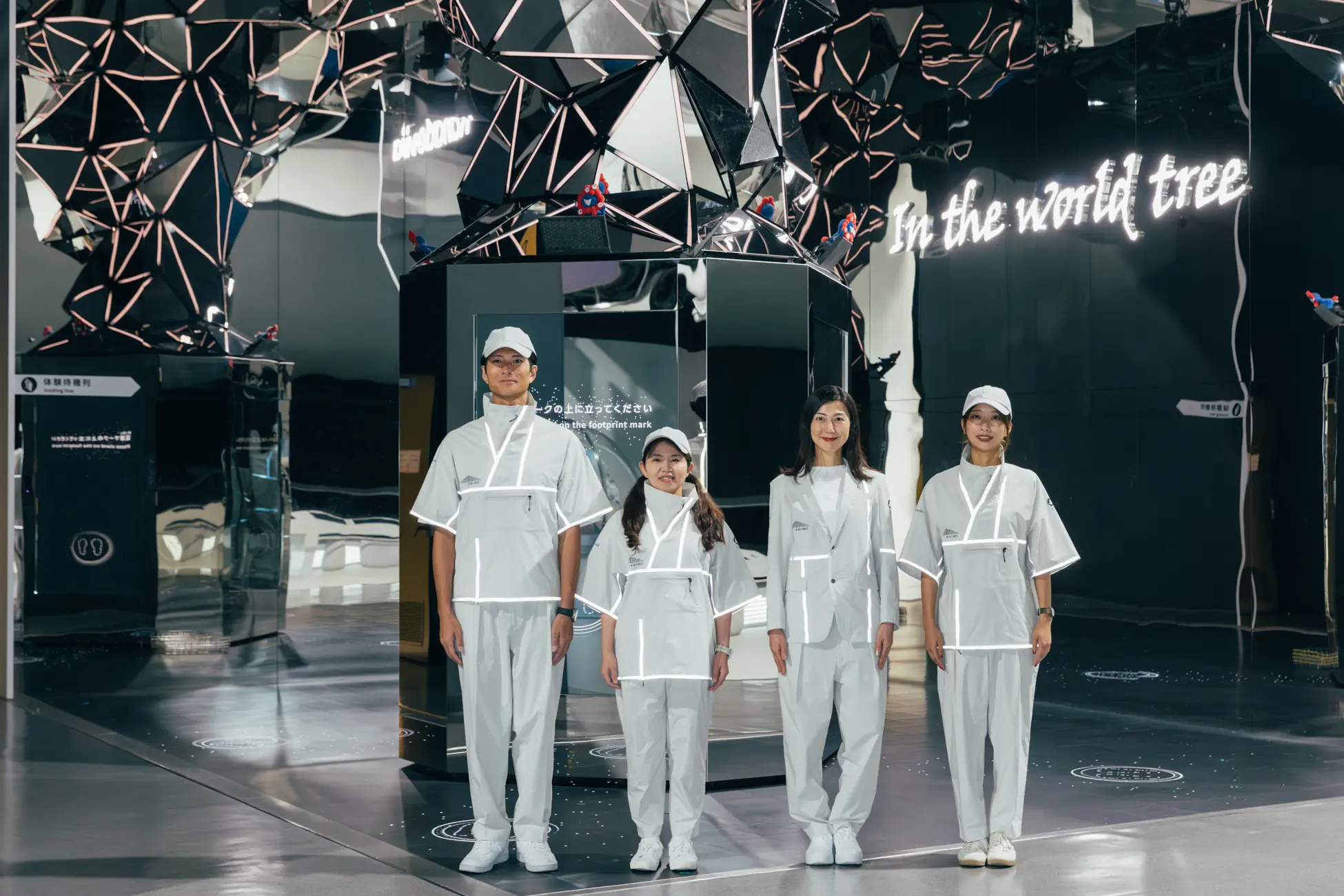 ステンレスミラーのブースと調和し、縫い目のリフレクターが反射することで「近未来的で清潔感がある」と好評です。視認性を高めるだけでなく、「リフレクション(反射)」というコンセプトを体現しています。