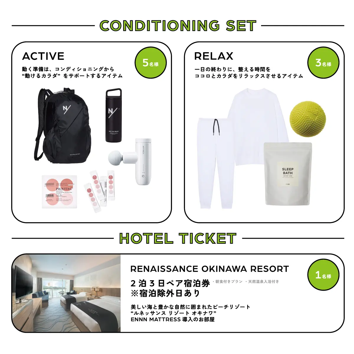 キャンペーン期間中、NEUTRALWORKS.商品を1回のお買い上げ金額が合計¥15,000(税込)以上の方(18歳以上)を対象に、ご応募の中から抽選で、毎日のREADYをサポートする「CONDITIONING SET」、またはNEUTRALWORKS.オリジナルENNN/MATTRESSを導入している宿泊施設の宿泊券をプレゼントいたします。ぜひご応募ください!