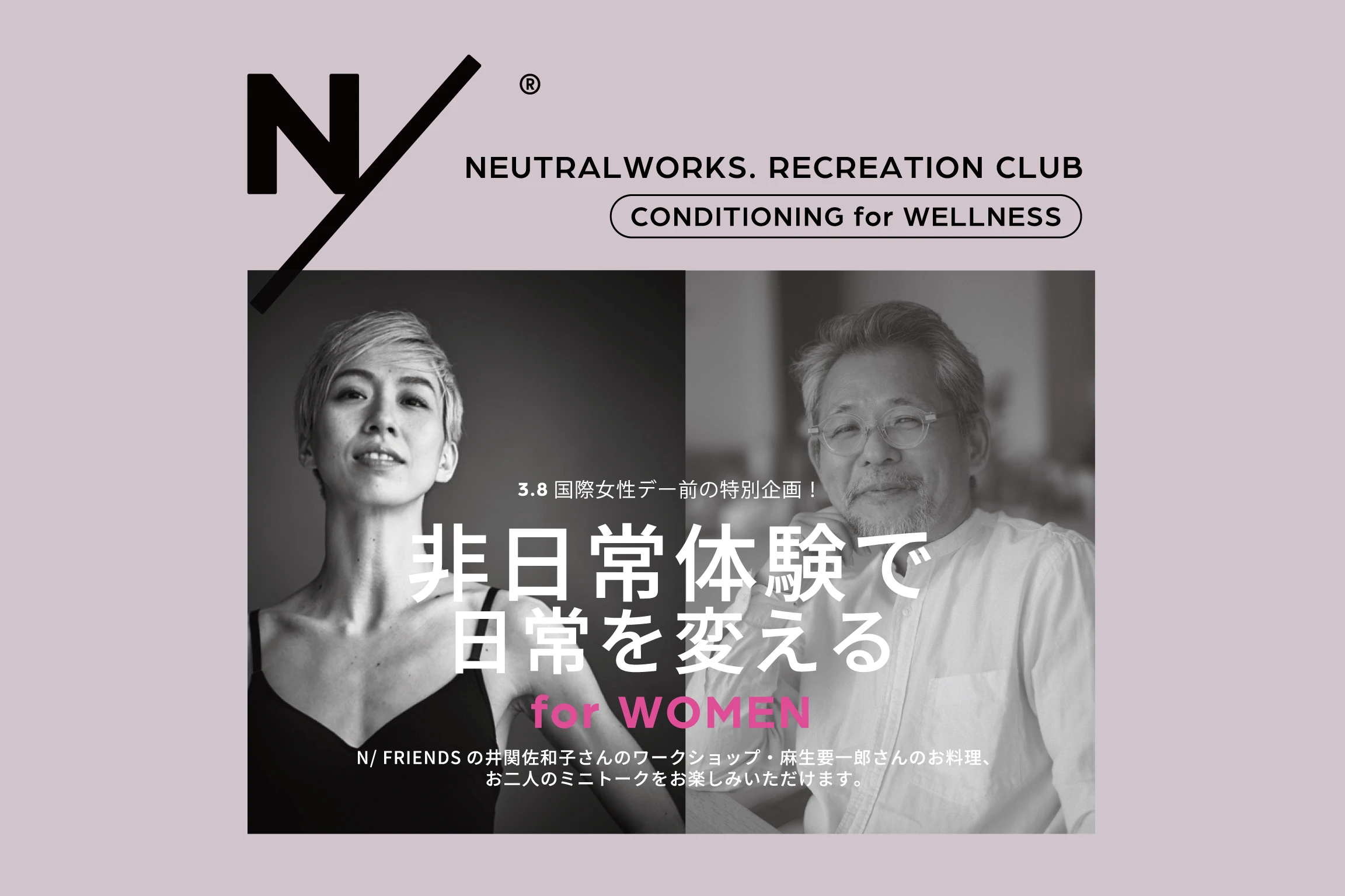 3月8日の国際女性デーを前に、NEUTRALWORKS. RECREATION CLUBによる 女性向けウェルネスイベントを開催します。会場は株式会社ゴールドウイン2F 。女性のためのココロとカラダの健康を考える体験型イベントです。